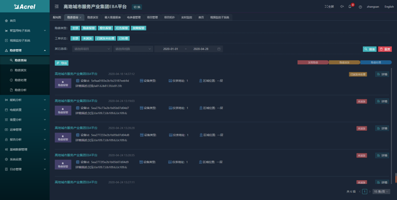 系統在產生報警或隱患后,系統可以針對工程人員派發工單,處理完以后工程人員能夠在系統中填寫相關工單任務記錄,以供歷史查詢。隱患統計支持對項目進行日、月、季、年的維度查詢,并能夠自定義時間查詢,將項目下隱患以曲線,圖表的形式展現。