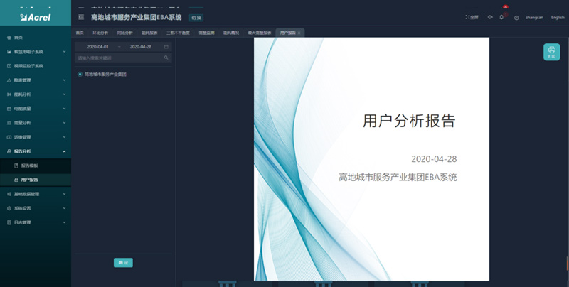 針對智慧用電部分,系統提供能耗分析功能,按回路可查詢日、月、年的能耗報表和曲線。