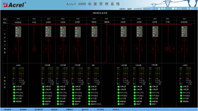 系統人機界面友好,以配電一次圖的形式直觀顯示配電線路的運行狀態,實時監測各回路電壓、電流、功率、功率因數、電能等電參數信息,動態監視各配電回路斷路器、隔離開關、地刀等合、分狀態,以及有關故障、告警等信號。