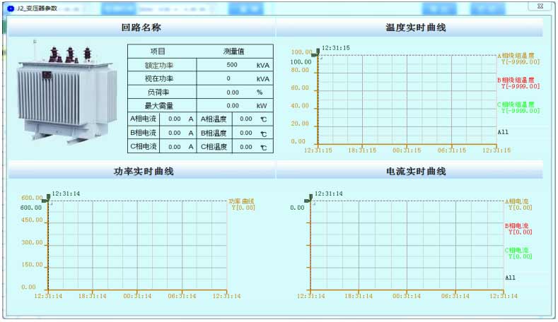 系統對配電系統總進線、主變壓器、重要負荷出線的運行狀態進行在線實時監視,用曲線顯示電流、變壓器運行溫度、有功需量、有功功率、視在功率、變壓器負荷率等運行趨勢,分析變壓器負荷率及損耗,方便運行維護人員及時掌握運行水平和用電需求,確保供電安全可靠。